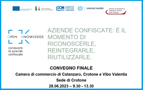 Mercoledì 28 giugno alle ore 9.30.00 si svolgerà a Crotone il convegno organizzato dalla Camera di commercio di Catanzaro-Crotone-Vibo Valentia per presentare i risultati emersi nel progetto "Open knowledge: conoscere le aziende confiscate", coordinato da Unioncamere, e realizzato all'interno delle linee di finanziamento previste dal PON legalità del ministero dell'Interno.