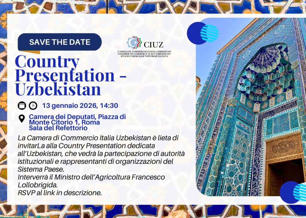 Martedì 13 gennaio 2026 alle ore 14:30 presso la Camera dei Deputati a Roma (Piazza di Monte Citorio 1, Sala del Refettorio) si svolgerà la Country Presentation dedicata all’Uzbekistan.