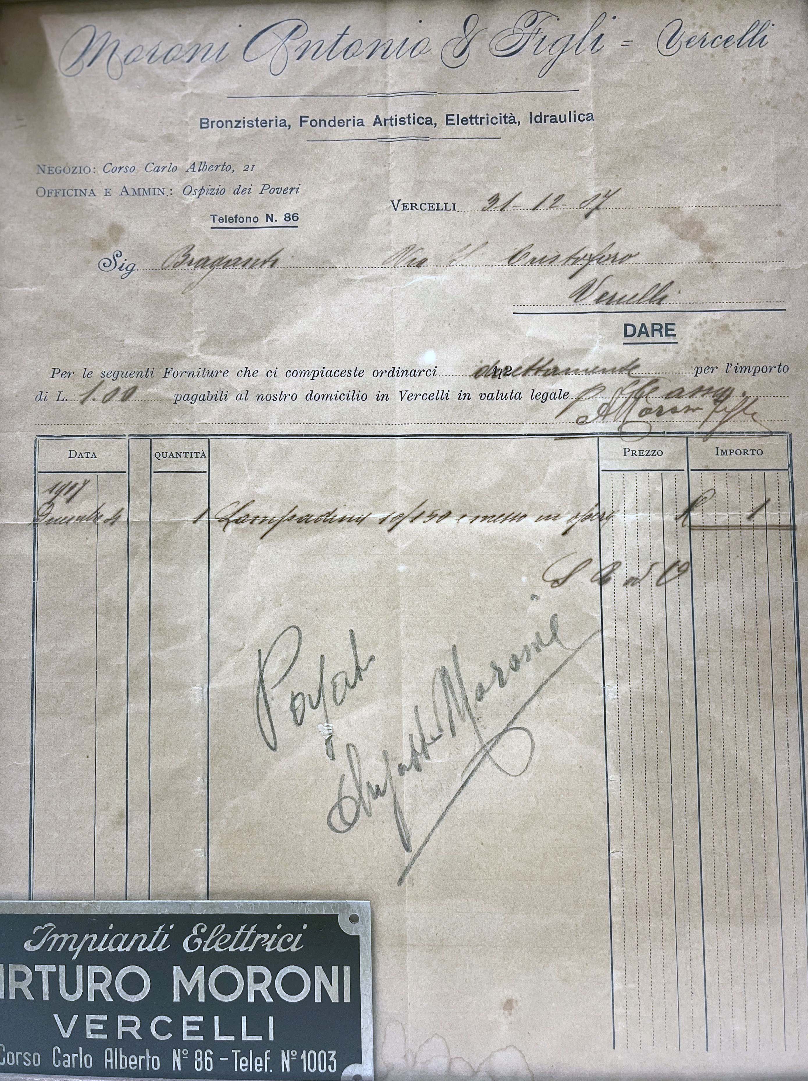 Ai primi del '900 Antonio Moroni si trasferì da Milano a Vercelli con parte della sua famiglia per prestare servizio presso l'Azienda autonoma della città sita nei pressi di corso San Martino. Nel 1904 fondò la Ditta Moroni & Massera specializzata in impianti di forza motrice. Nell’arco di tre anni la ditta si trasformò in Moroni Antonio & Figli (Arturo, Ferdinando, Gioconda e Tiziano). Nel 1912 venne rifondata con il nome di Arturo Moroni & F.lli ( che erano Ferdinando, Gioconda e Tiziano). Il negozio era in corso Carlo Alberto (adesso corso Libertà) e l'officina presso l’Ospizio dei poveri in via F.lli Garrone. L’ospizio all’epoca ospitava i bambini orfani: molti di quei ragazzi cominciarono a lavorare nell'officina dell’impresa. In seguito alla morte di Ferdinando e Tiziano la ditta continuò l'attività con i figli Antonio e Arturo (nomi ricorrenti nella famiglia Moroni). Oggi l'intestazione della ditta è sempre Arturo Moroni & F.lli snc ma i soci sono Arturo, Simonetta e Marinella Moroni (figlie di Antonio).