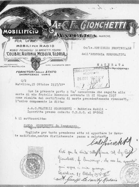 La Gionchetti fu fondata da Aurelio Gionchetti presumibilmente nel 1921, data del primo documento storico rinvenuto nell’Archivio Storico del Comune di Matelica. Aurelio era un intraprendente giovane di venticinque anni quando iniziò l’attività di falegnameria per la produzione di mobili, ma di lì a poco, nel 1923, venne a mancare. L’attività fu continuata dai fratelli Domenico e Carlo. La produzione cambiò nei decenni: dalle lavorazioni di falegnameria ai tavolinetti per macchine da scrivere e calcolatrici, ai giochi in legno, ai mobili metallici per archivi e biblioteche delle più importanti università e istituti culturali italiani fino alla lavorazione conto terzi di componenti di arredo. Domenico Gionchetti, che svolgeva anche l’attività di fotografo, morì nel 1937. L'azienda fu portata avanti da Carlo Gionchetti che nel dopoguerra fu affiancato da Alipio Baroni, prima come dipendente, poi come socio. Per trent’anni (dal 1948 al 1977) Baroni sarà per la FGM una figura di primaria importanza sia per le idee innovative, sia come propulsore di attività aziendali. Nel 1963 l’azienda fu trasformata in società per azioni e nel 1977 le quote azionarie furono trasferite ai signori Sesto Brancaleoni e Liana Mariotti, sino al 1983. In tal anno ci fu un nuovo passaggio azionario alla famiglia Di Mattia, tuttora detentrice proprietaria della società. Nel 2018 la stessa venne trasformata in società a responsabilità limitata. Nei termini dell’impiego di personale l’azienda, che contava 15/20 dipendenti negli anni Trenta, arrivò crescere fino a 50 stabilizzandosi su questo numero per decenni fino agli inizi del 2000. In seguito alla crisi economica del 2008, ebbe una drastica riduzione ritornando sui livelli degli anni Trenta ma successivamente, a seguito di nuove iniziative e investimenti, aumentò nuovamente: oggi conta 70 dipendenti con prospettiva di crescita ulteriore. La gestione aziendale, a partire dal 1977, non si è più identificata con la proprietà. Da quell’anno fino al 1980 l’ha diretta Loris Brancaleoni, dal 1980 al 1998 Sandro Gubinelli e infine dal 1998 ad oggi la guida Claudio Mercorelli.