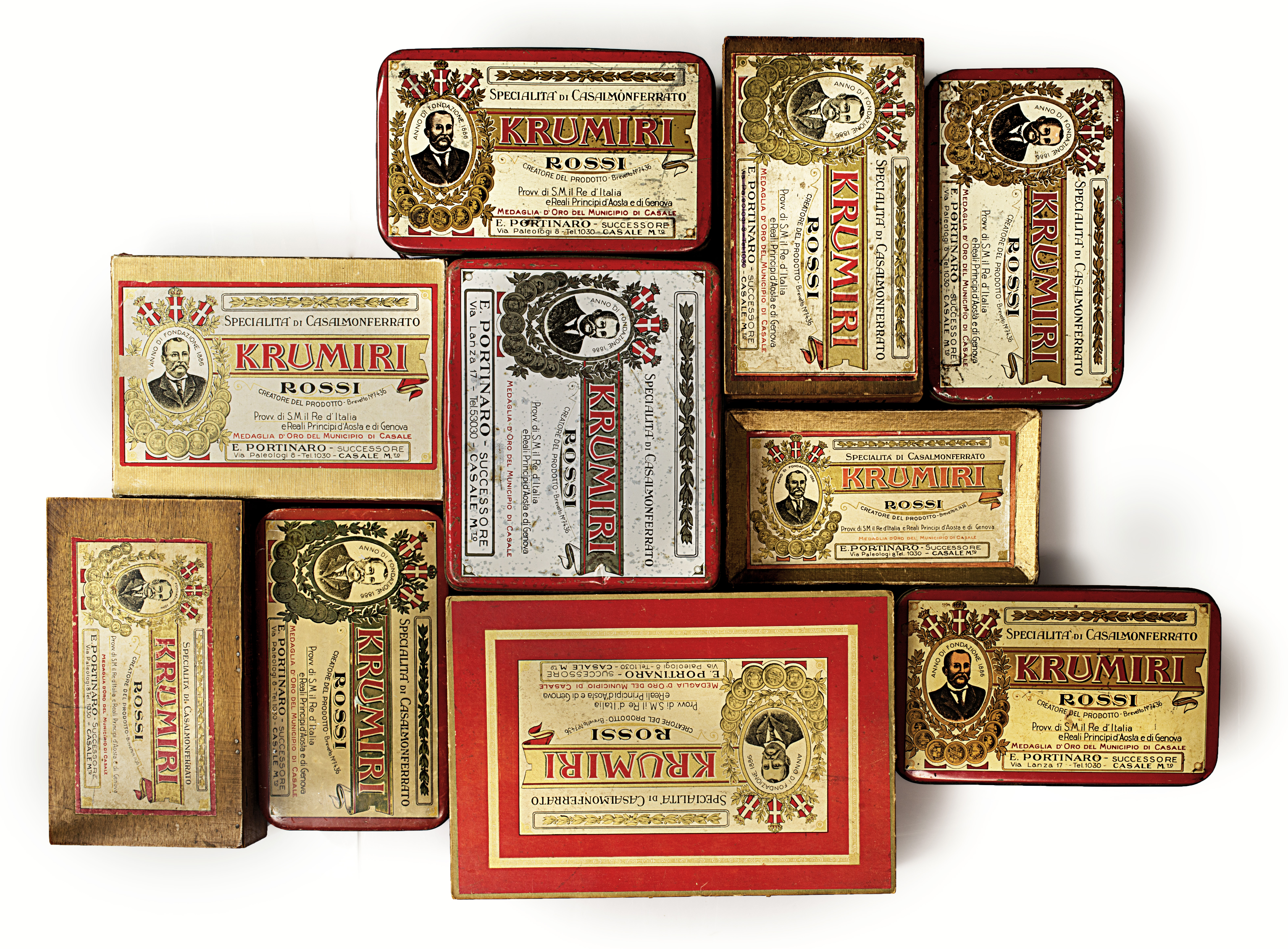La leggenda narra che una sera dei primi anni del 1870 il sig. Rossi, con alcuni amici un po’ allegri, di ritorno dal Caffè della Concordia chiamato il Bottegone (ora Piazza Mazzini) dopo aver bevuto il Krumiro (bevanda dell’epoca), propose per finire la serata una tappa al suo laboratorio in via Paleologi (in Casale Monferrato) per fare qualche dolce mescolando e combinando: forse così nacquero i Krumiri. Tuttavia, la nascita della specialità venne fissata nell’anno 1878 (inventore Domenico Rossi, anno 1878, Brevetto n. 7436). All’inventore Domenico Rossi succedette il figlio Pompeo (1907) attraverso la “Reale Pasticceria Rossi unico Inventore dei rinomati Krumiri”, poi rilevata da Angelo Ariotti (1916) a cui subentrò il figlio Emilio Ariotti sempre in via Paleologi n. 6. Sarà proprio il laboratorio di produzione di via Paleologi a far intrecciare le storie della famiglia Rossi prima, della famiglia Ariotti dopo con la famiglia Portinaro. Fu infatti nel 1953 che il noto pasticcere Ercole Portinaro, dopo aver imparato l’arte a Torino e aver avviato una sua attività di pasticceria fresca nel Caffè Pasticceria Rossignoli in via Lanza n. 6 fin dal 1938, rilevò l’attività del laboratorio di via Paleologi, compresa la produzione dei Krumiri Rossi. Fu Ercole Portinaro a sostituire la confezione di legno con quella in metallo rosso per conservarne l’aroma. Nel 1953 il negozio e il forno erano ancora ubicati in via Paleologi. Solo negli anni Sessanta il negozio si trasferì in via Lanza n. 17 sempre con forno annesso. Col figlio di Ercole, Romolo, i Krumiri ampliarono giorno dopo giorno l’originaria dimensione locale, per conquistare l’Italia e il mondo. In pochi anni, sarebbero arrivati al Quirinale, a Montecitorio e addirittura alla Casa Bianca. Nulla era cambiato nella produzione giornaliera eseguita a mano e nella vendita di un unico prodotto i KRUMIRI ROSSI con l'antica ricetta sotto la denominazione PORTINARO dal 1953.