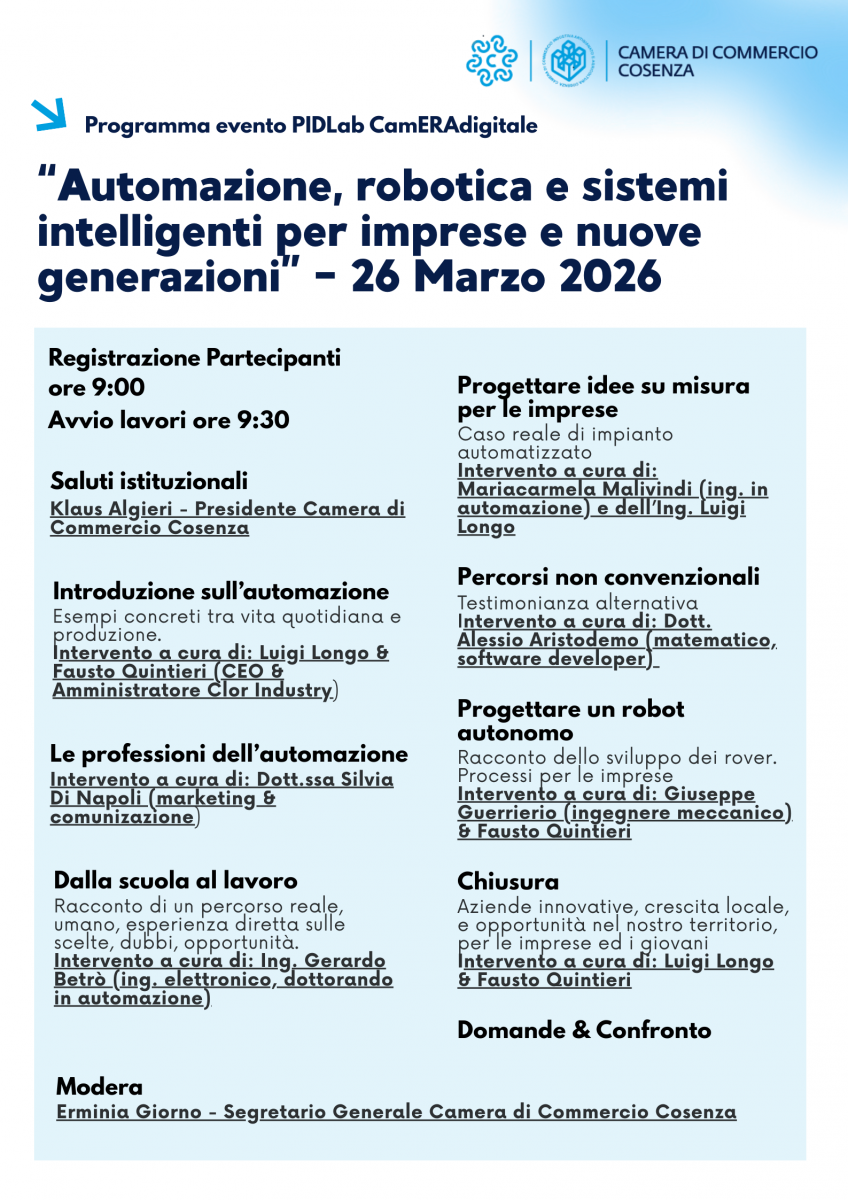 La Camera di commercio di Cosenza attraverso il suo PIDLAB CamERAdigitale organizza un evento dedicato a "Automazione, robotica e sistemi intelligenti per imprese e nuove generazioni".