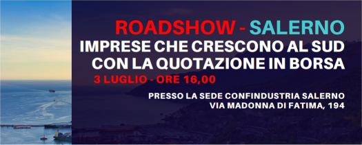 22/06/2023 - Si terrà a Salerno la prima tappa del roadshow “Imprese che crescono al sud con la quotazione in Borsa” lunedì 3 luglio 2023, alle ore 16.00 presso Confindustria Salerno, via Madonna di Fatima 194.